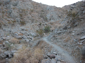 I hike to the top of the saddle past where the Schey Trail takes off to the left and the Hopalong Trail continues on past the Bighorn Club. Looking back I can see where the Hopalong Trail continues toward its starting point behind the Palm Desert Target. Doing this entire trail before the year is out is on my list.